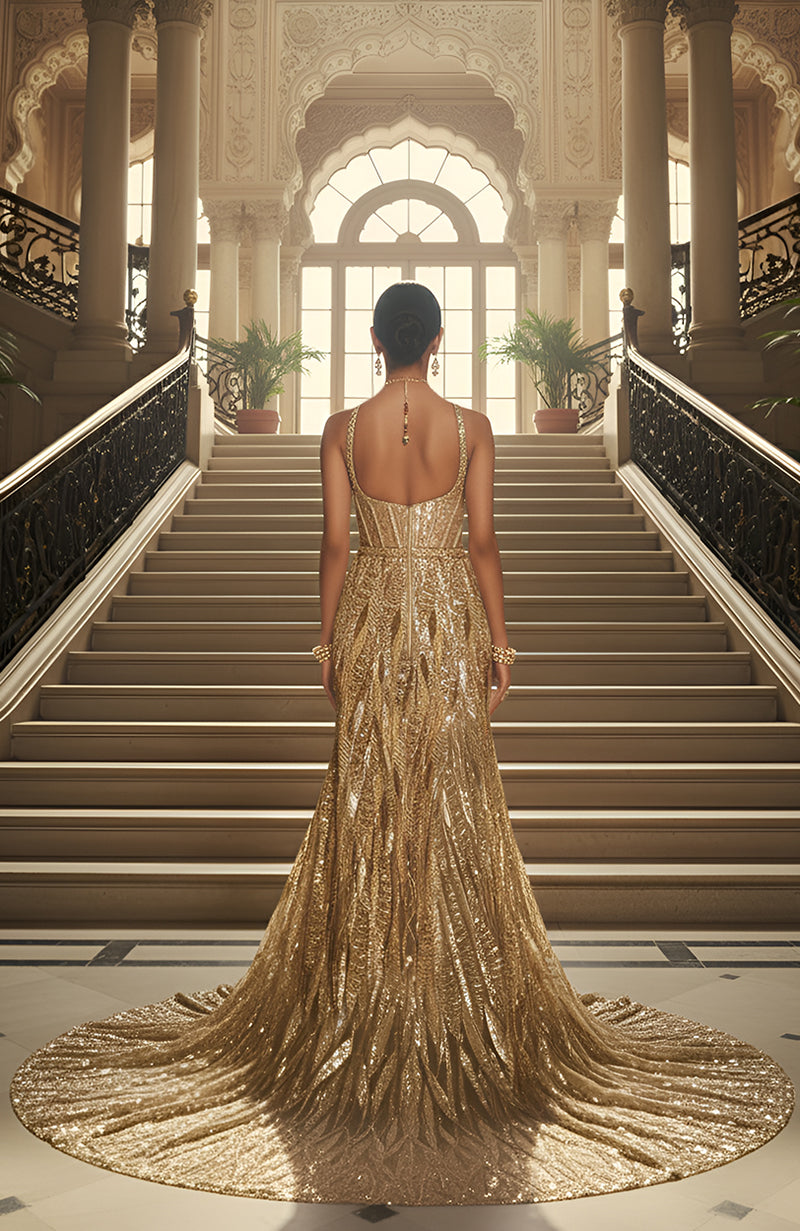 Hand-embroidered in muted champagne gold tones, the surface catches light subtly—never loudly—allowing silhouette, craftsmanship, and presence to take centre stage. A thigh-high slit introduces modern movement, while the extended train adds a ceremonial finish, making this gown ideal for bridal receptions, black-tie celebrations, and destination soirées.