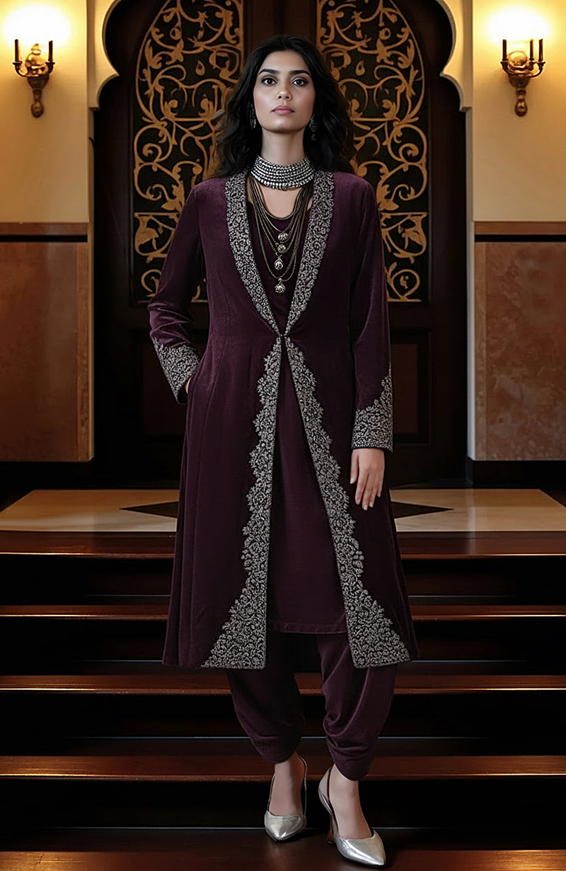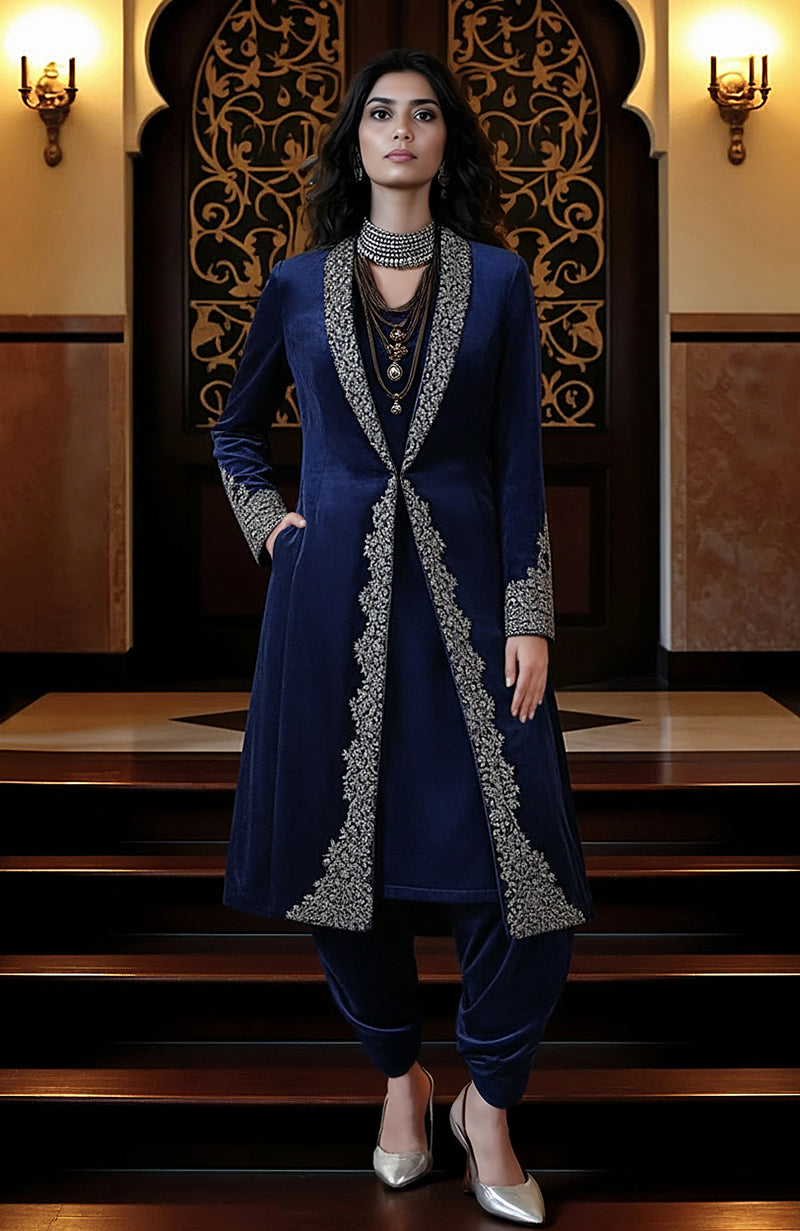 At the heart of this ensemble lies the meticulously tailored longline jacket, adorned with intricate silver embroidery along the lapels and cuffs, the jacket exudes an aura of refined luxury.