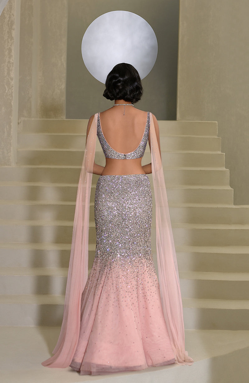 NAIRA- Pink Crystal and Pearls Hand Embroidered Mermaid Lehenga with Cape