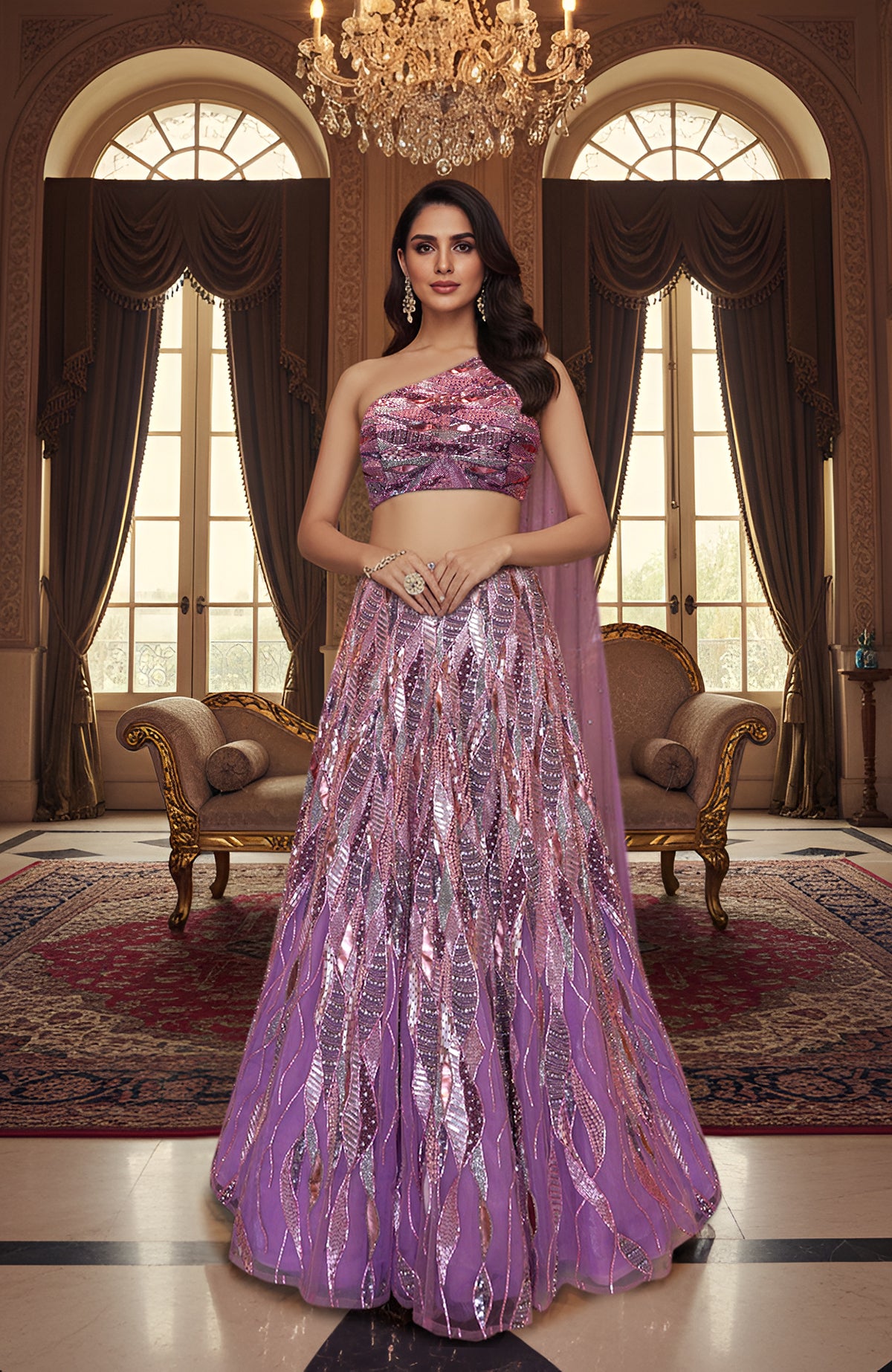The Lilac Laila Lehenga Set is a couture statement for the bride who chooses herself. Sculpted in opulence, this look captures the luminous force of Laila—a woman who doesn’t wait to be seen, but commands presence with every step.