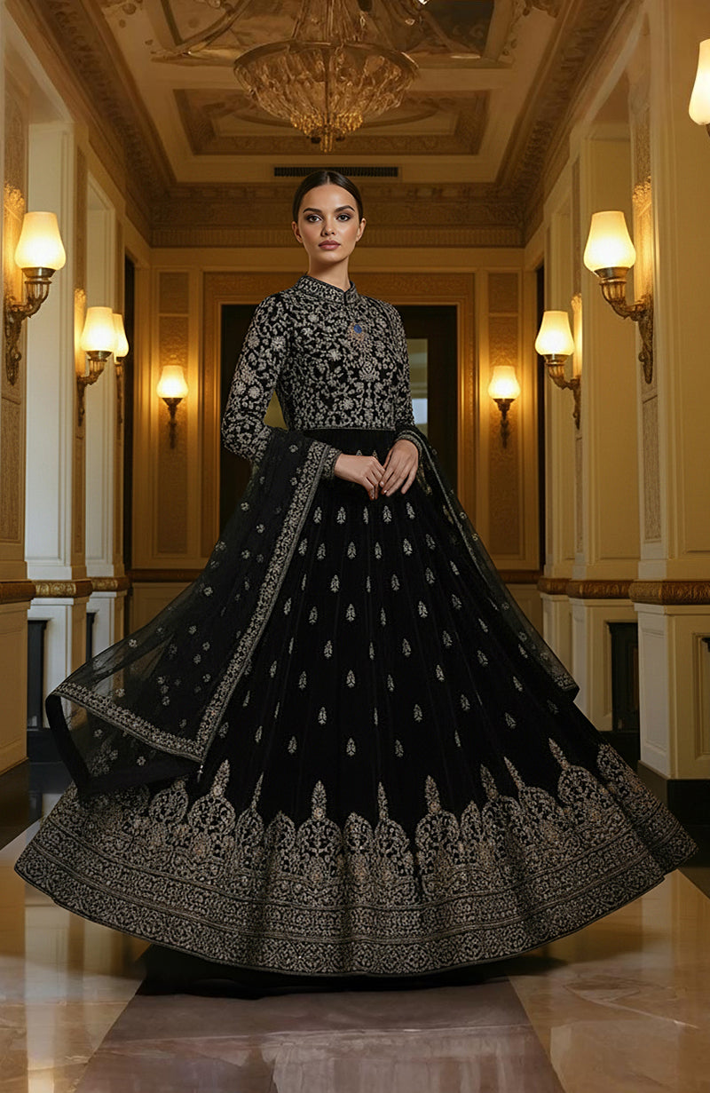 The velvety flare cascades beautifully with scattered motifs, giving the garment richness without weight—perfect for winter weddings, regal festivities, sangeet nights, or reception soirées. The high-neck, long-sleeved bodice brings an old-world Mughal charm while offering warmth, structure, and a flattering, elongated frame.