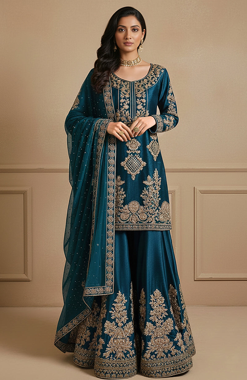 A stunning teal sharara set with intricate gold embroidery, exuding regal elegance. The ensemble consists of a kameez (tunic), wide-legged sharara pants, and a sheer dupatta, all adorned with exquisite detailing.  A perfect choice for formal occasions and weddings.