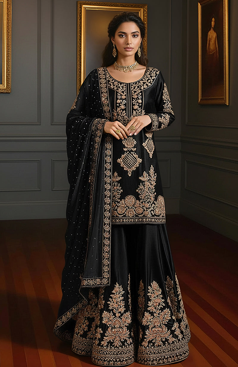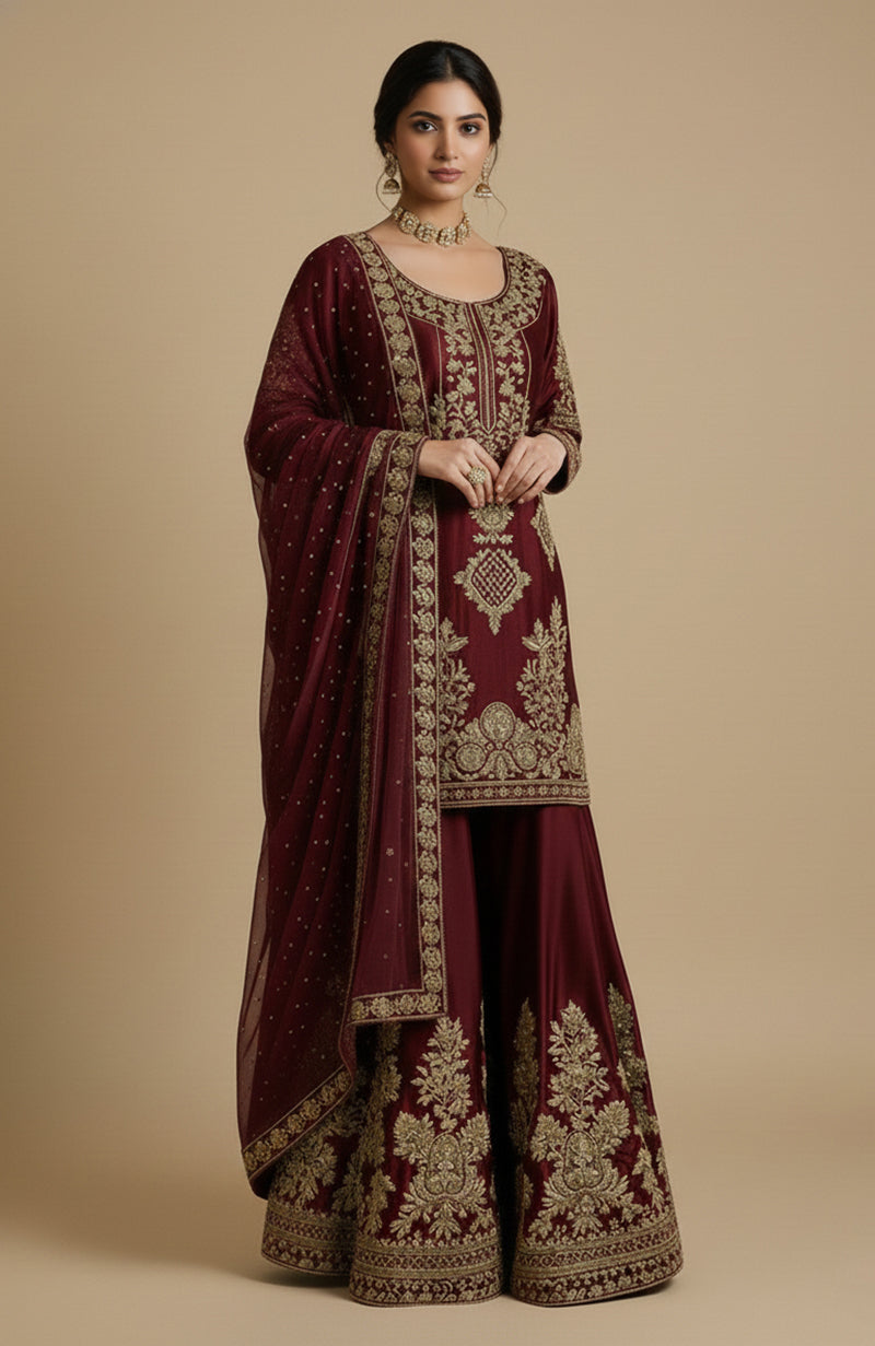 • Sharara (Wide-Leg Pants): The sharara pants' hemline is heavily embroidered with dense gold floral motifs, seamlessly blending with the tunic’s embroidery. The wide-leg silhouette adds grandeur and movement to the outfit.