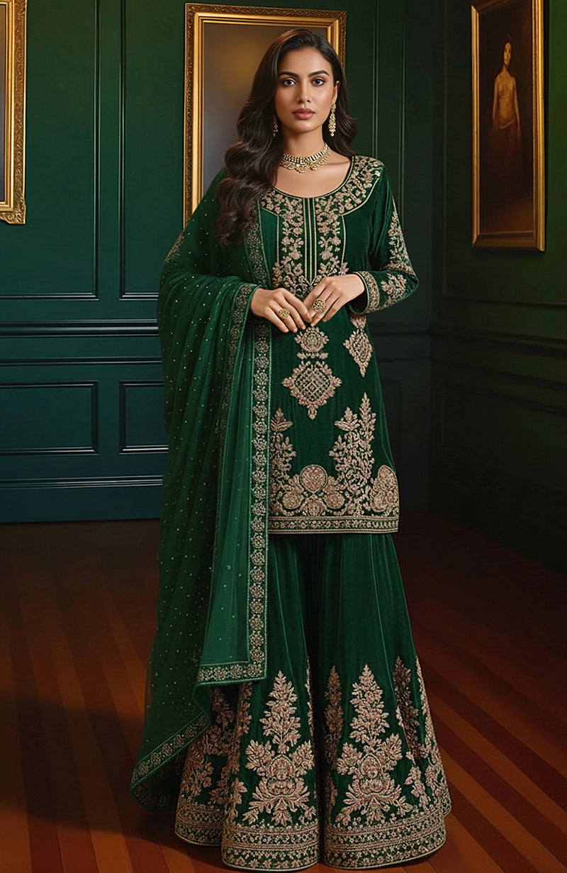 Teal Gold Embroidered Velvet Gharara set