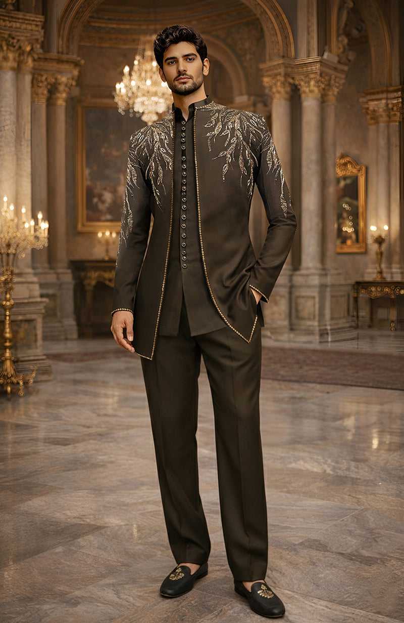 A composed expression of modern masculinity. This Shadow Black achkan from the Zar Code collection is cut in a sharp, elongated silhouette and finished with restrained gold embroidery that traces the body with intention—never excess. The surface work moves quietly across the shoulders and chest, engineered to catch light subtly, not demand it.