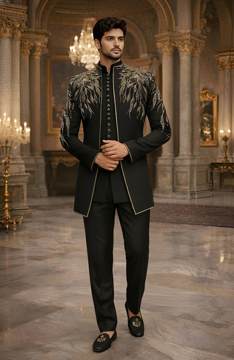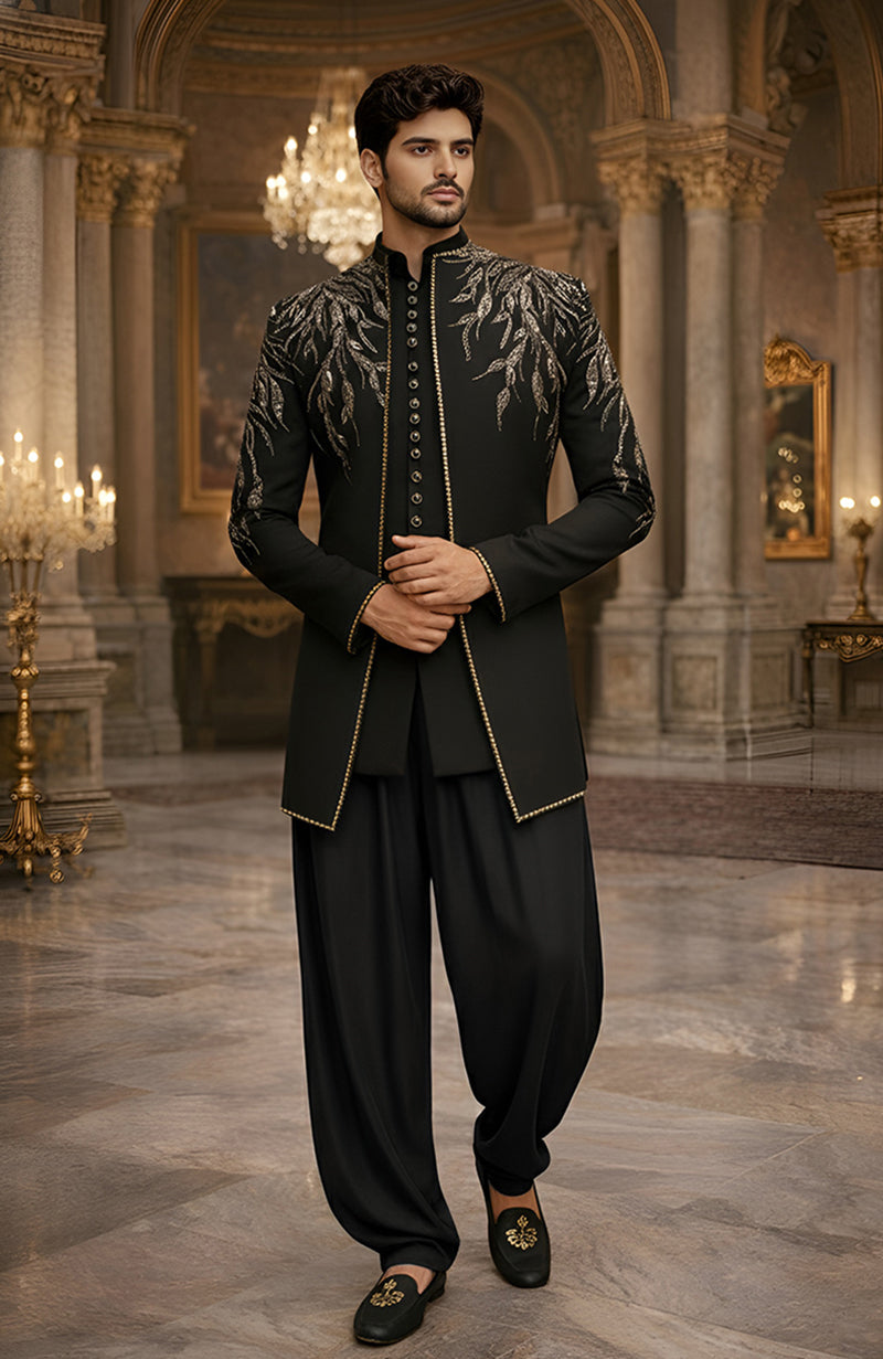 Zar Code Black Gold Embroidered Achkan Set