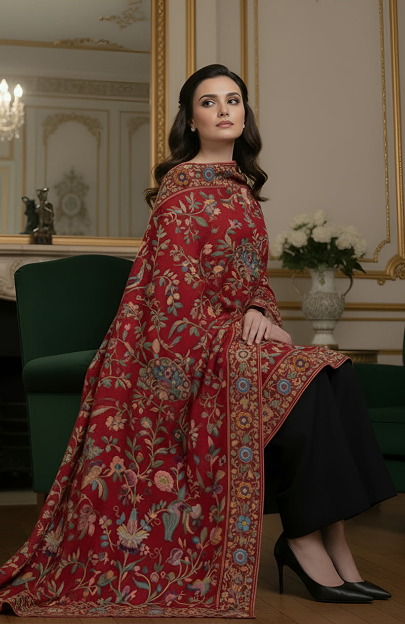 A masterpiece of timeless elegance, the Gulnaar Rouge Shawl features exquisite Parsi Gara embroidery rendered on luxurious pure pashmina. The rich rouge base is adorned with classic Gara florals, birds, and vine motifs—each motif meticulously embroidered in multi-hued silk threads, reflecting the heritage of centuries-old Persian-Parsi craftsmanship.